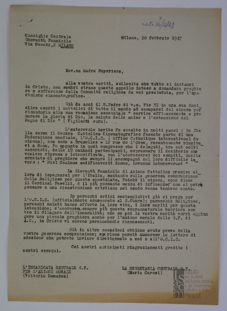 Lettera a firma di Vittoria Donadeo, incaricata centrale della Gioventù Femminile per l'Azione morale, e di Maria Carosi, segretaria centrale di G.F., alla madre superiora della Piccola Casa di S. Vincenzo
