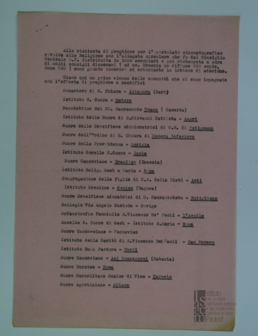 Comunità che hanno aderito alla richiesta di pregare per l'apostolato cinematografico