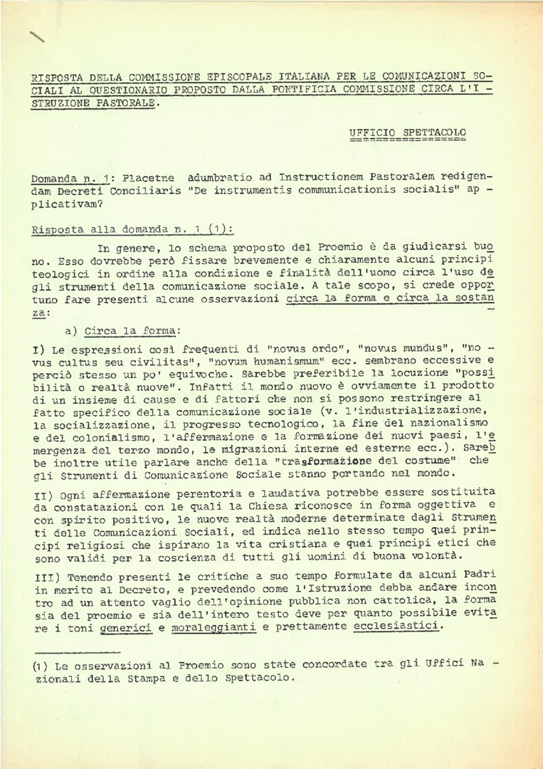 "Risposta della Commissione Episcopale Italiana per le comunicazioni sociali al questionario proposto dalla Pontificia Commissione circa l'istruzione pastorale"