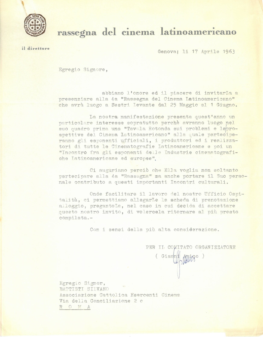 Lettera di Gianni Amico, direttore della Rassegna del cinema latino americano, a Silvano Battisti, segretario generale dell'ACEC
