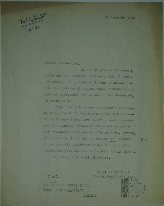 Lettera di mons. Gilla Vincenzo Gremigni, direttore generale dell'ACI, a Luigi Gedda, presidente del Centro cattolico cinematografico - CCC