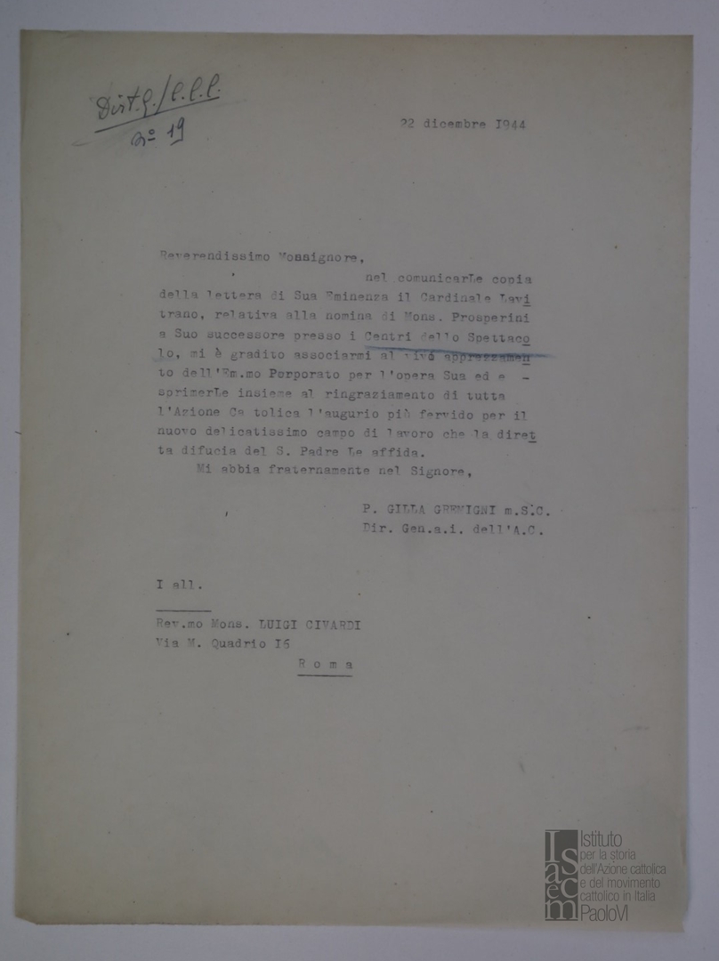 Lettera di mons.Gilla Vincenzo Gremigni, direttore generale dell'ACI, a mons. Luigi Civardi