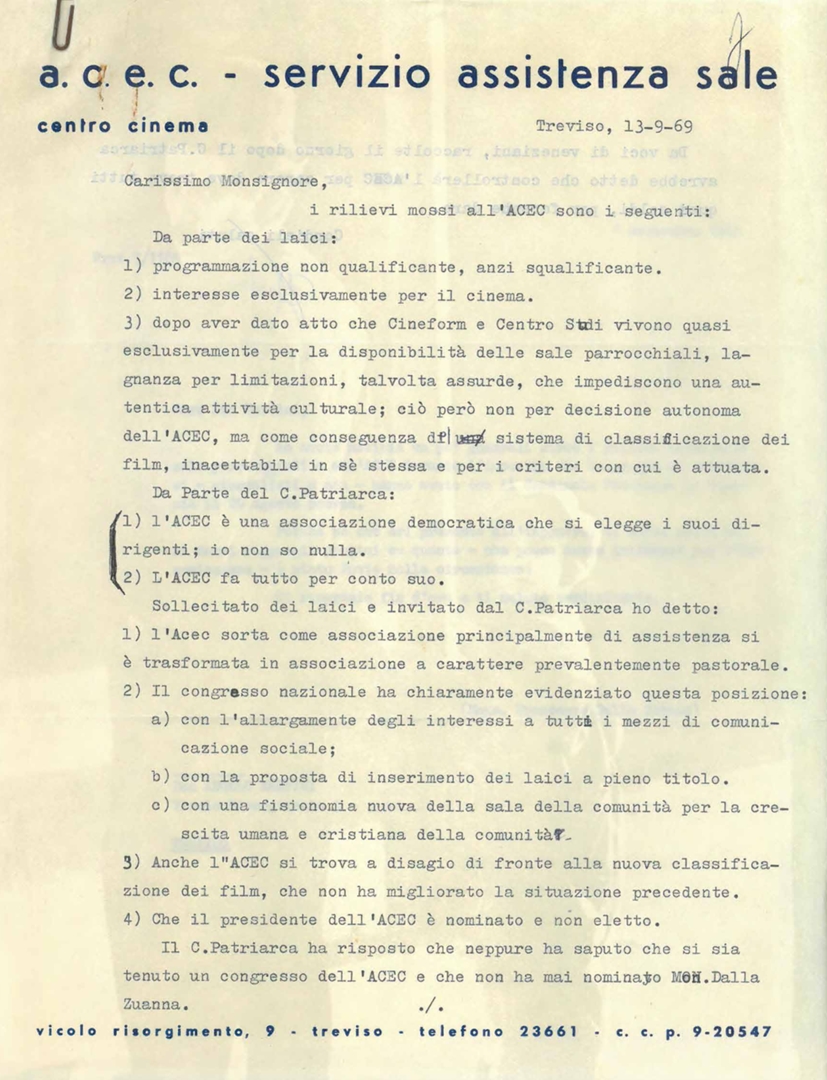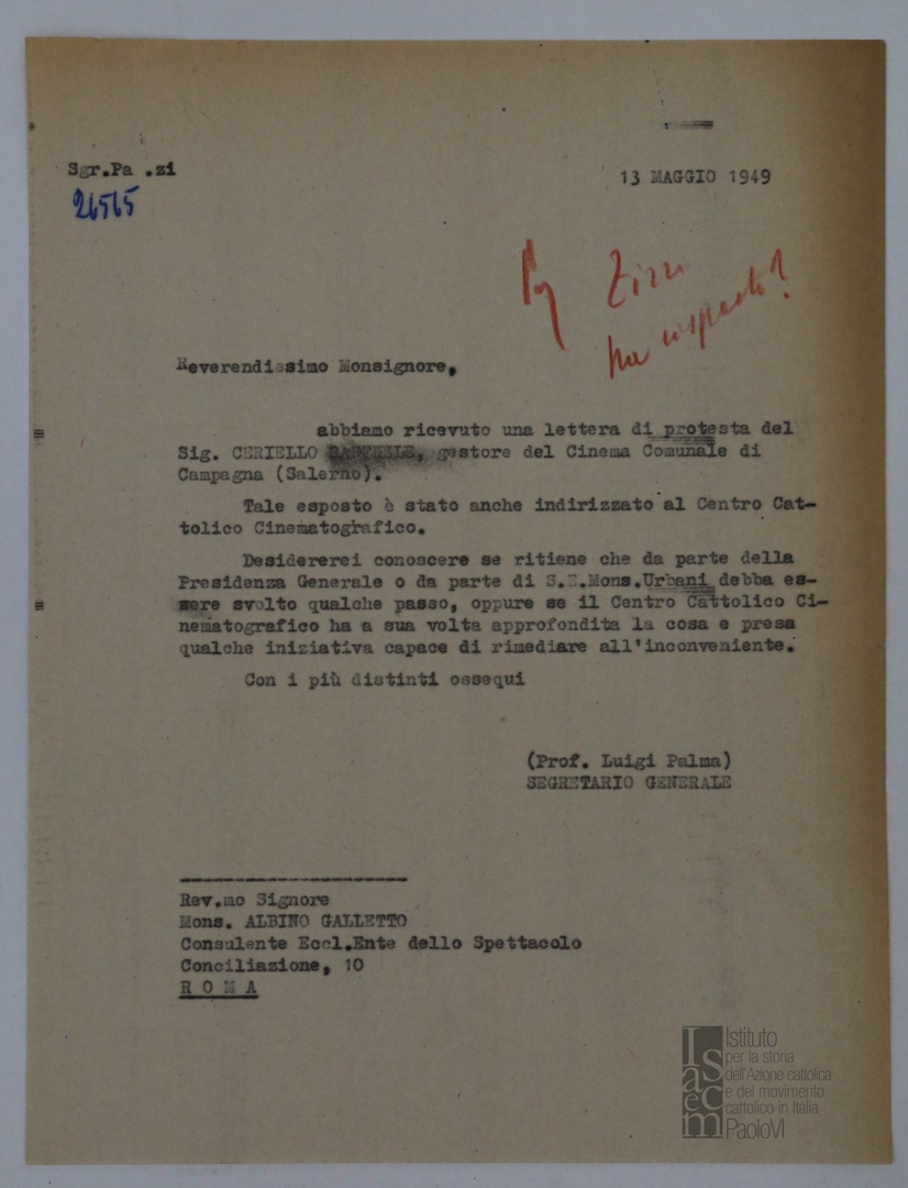 Lettera di Luigi Palma, segretario generale del Centro nazionale di Azione Cattolica di Roma, a mons. Albino Galletto, consulente ecclesiastico dell'Ente dello spettacolo