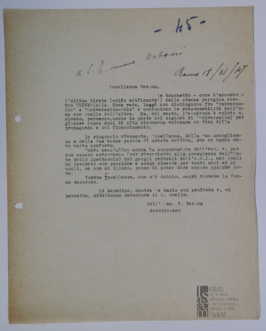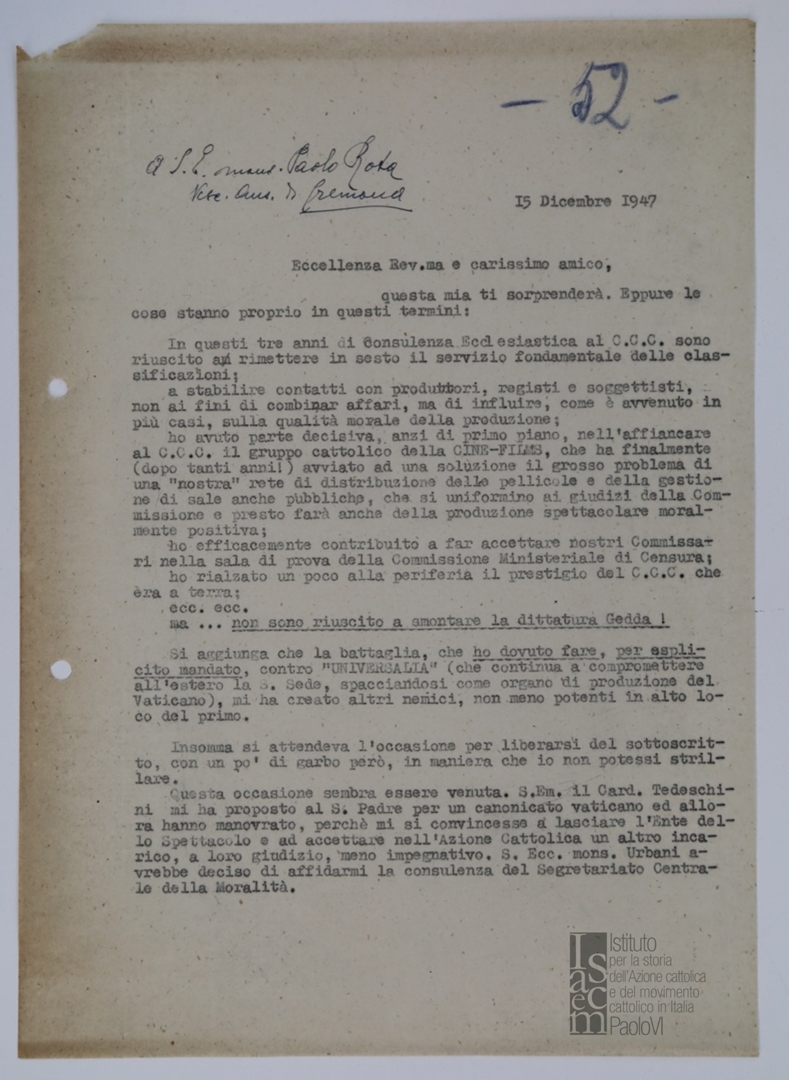 Lettera di mons. Ferdinando Prosperini, consulente ecclesiastico dell'Ente dello spettacolo, a mons. Giovanni Battista Montini, sostituto alla segreteria di Stato di Sua SantitÃ