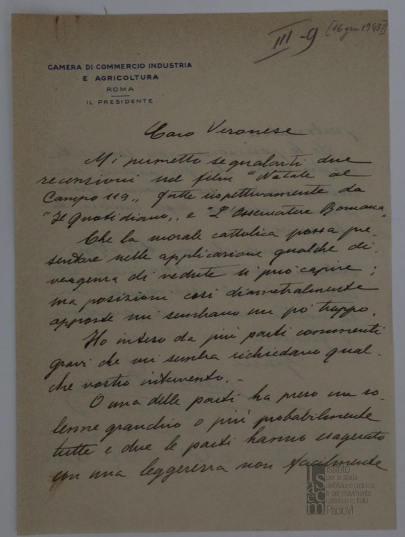 Lettera di Vittorino Veronese, presidente generale dell'ACI, alla Presidenza generale dell'ACI