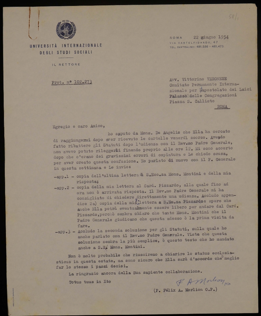 Lettera di padre Félix Morlion, rettore dell'Università internazionale di studi sociali, a Vittorino Veronese, presidente del Comitato permanente per i congressi internazionali dell'apostolato dei laici