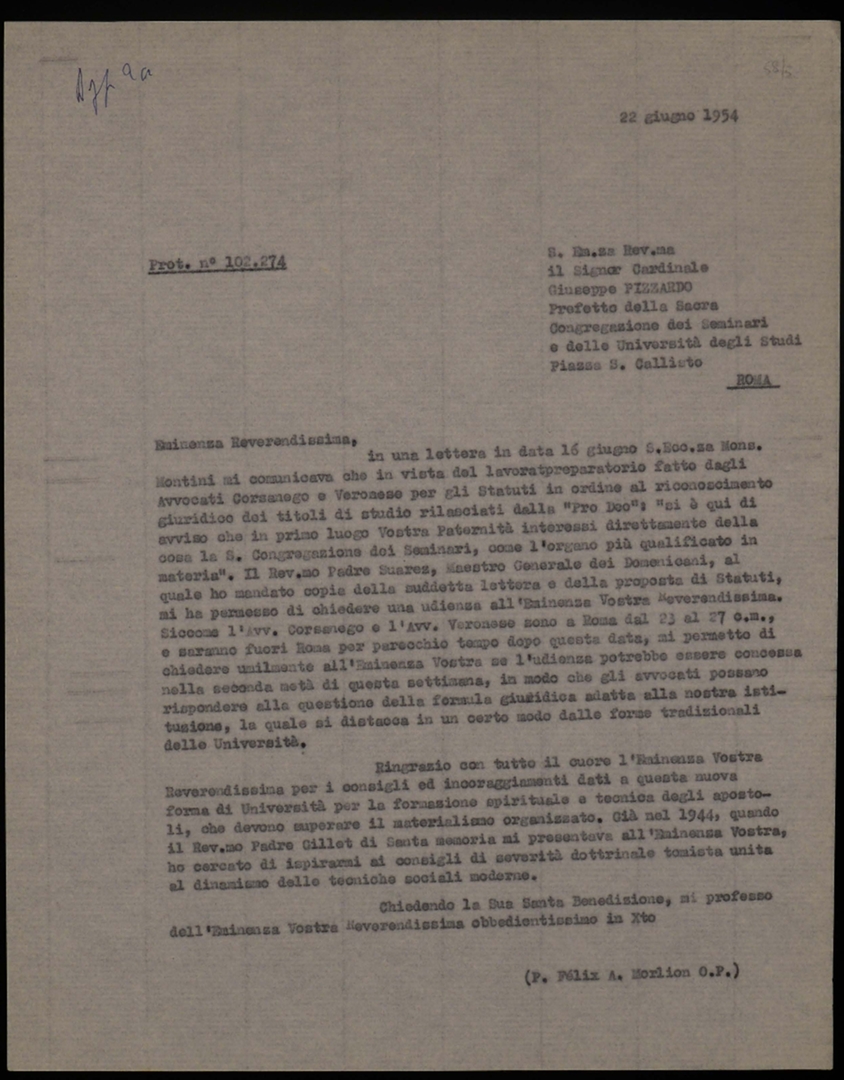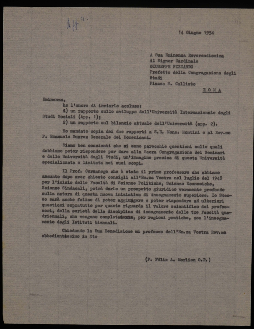 Lettera di padre Félix Morlion, rettore dell'Università internazionale di studi sociali, al cardinale Giuseppe Pizzardo, prefetto della Congregazione degli studi