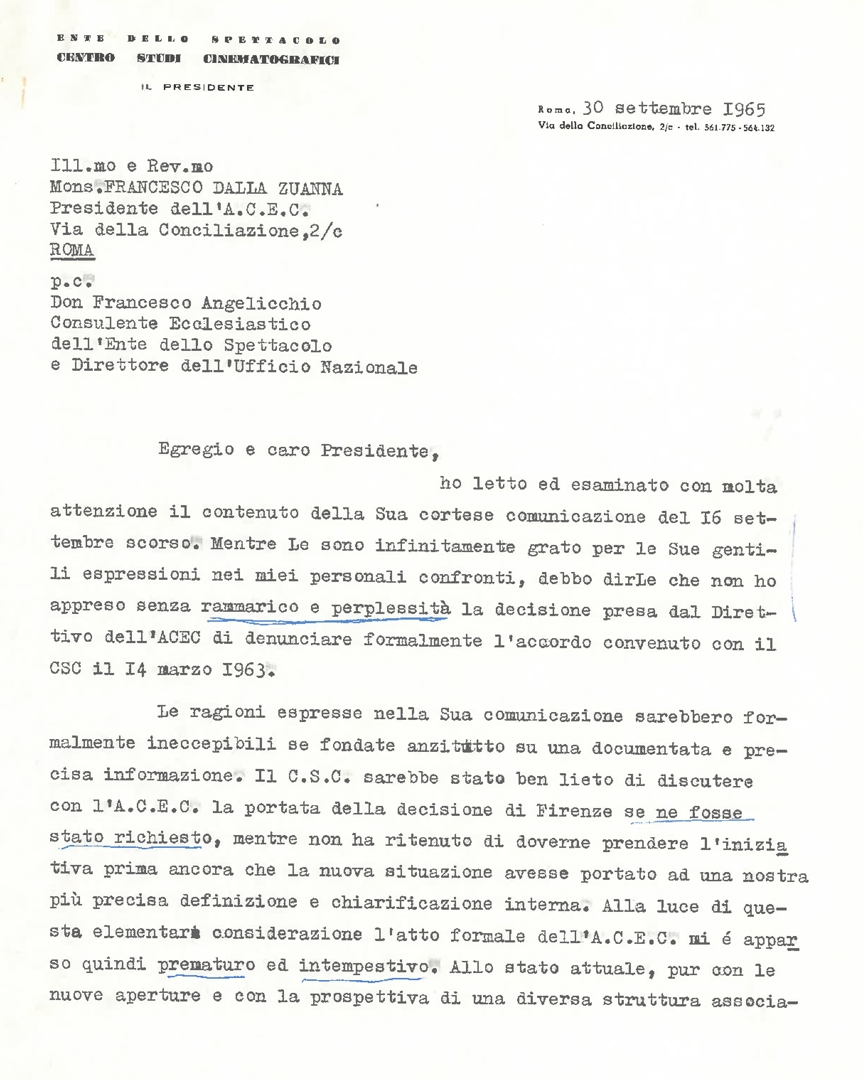 Lettera di Renato May, presidente del Centro studi cinematografici - CSC, a mons. Francesco Dalla Zuanna, presidente dell'ACEC