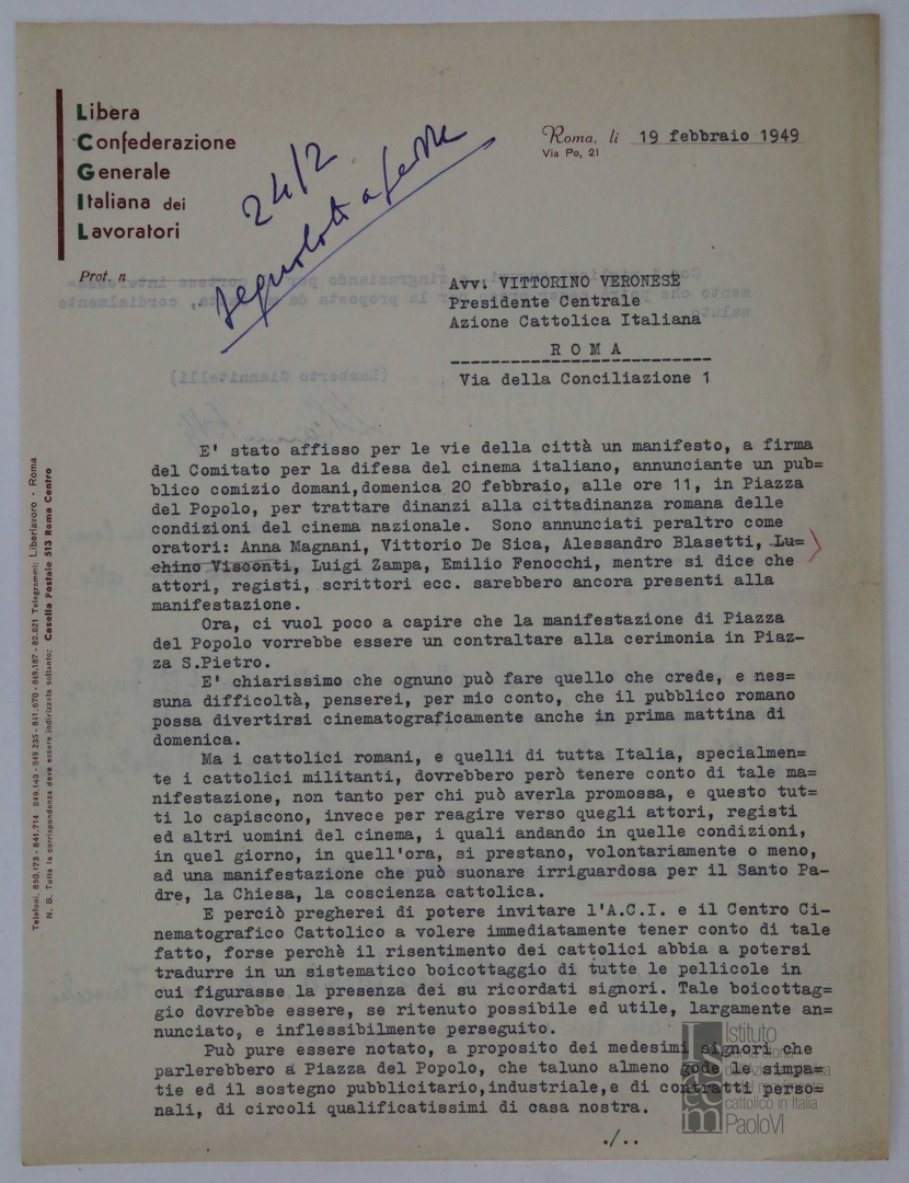 Lettera di Lamberto Giannitelli su carta intestata della Libera confederazione generale italiana dei lavoratori, a Vittorino Veronese, presidente generale dell'ACI