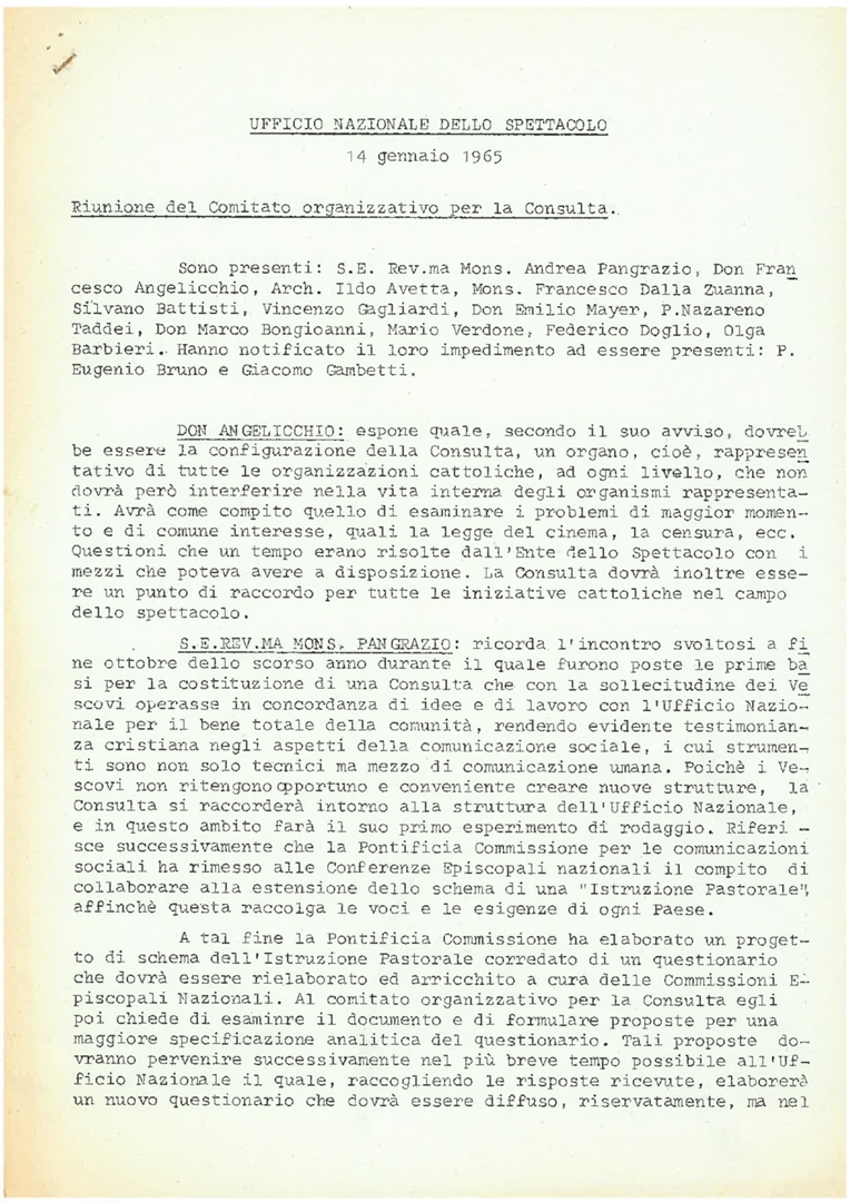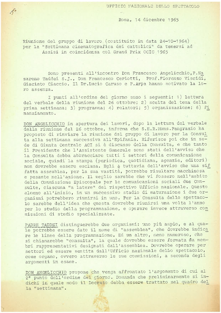 Ufficio nazionale dello spettacolo. Riunione del gruppo di lavoro per la "Settimana cinematografica dei cattolici" da tenersi ad Assisi in coincidenza col Grand Prix OCIC 1965