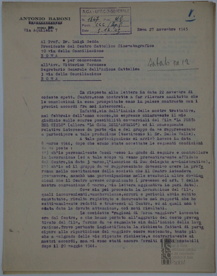 Lettera di Antonio Baroni, consulente amministrativo del Centro cattolico cinematografico - CCC, a Luigi Gedda, presidente del Centro