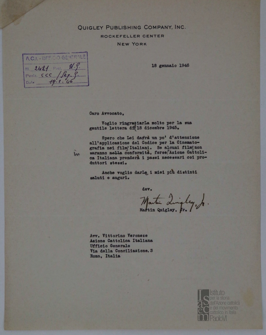Lettera di Martin Quigley, della Quigley Publishing Company di New York, a Vittorino Veronese, segretario generale dell'ACI