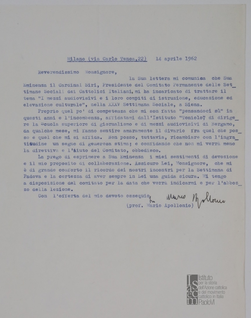 Lettera di don Girolamo Grillo, segretario aggiunto della Settimana sociale dei cattolici, al prof. Mario Apollonio