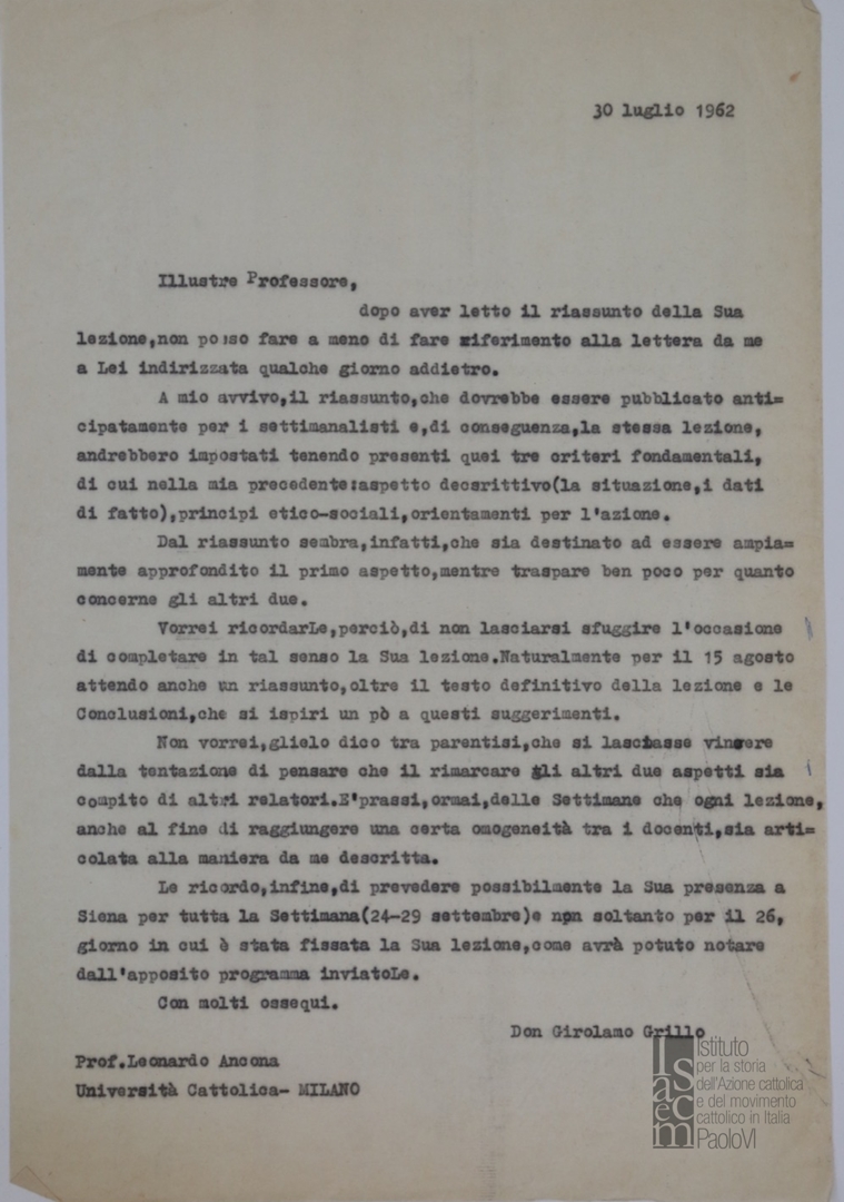 Lettera di don Girolamo Grillo, segretario aggiunto della Settimana sociale dei cattolici, al prof. Leonardo Ancona