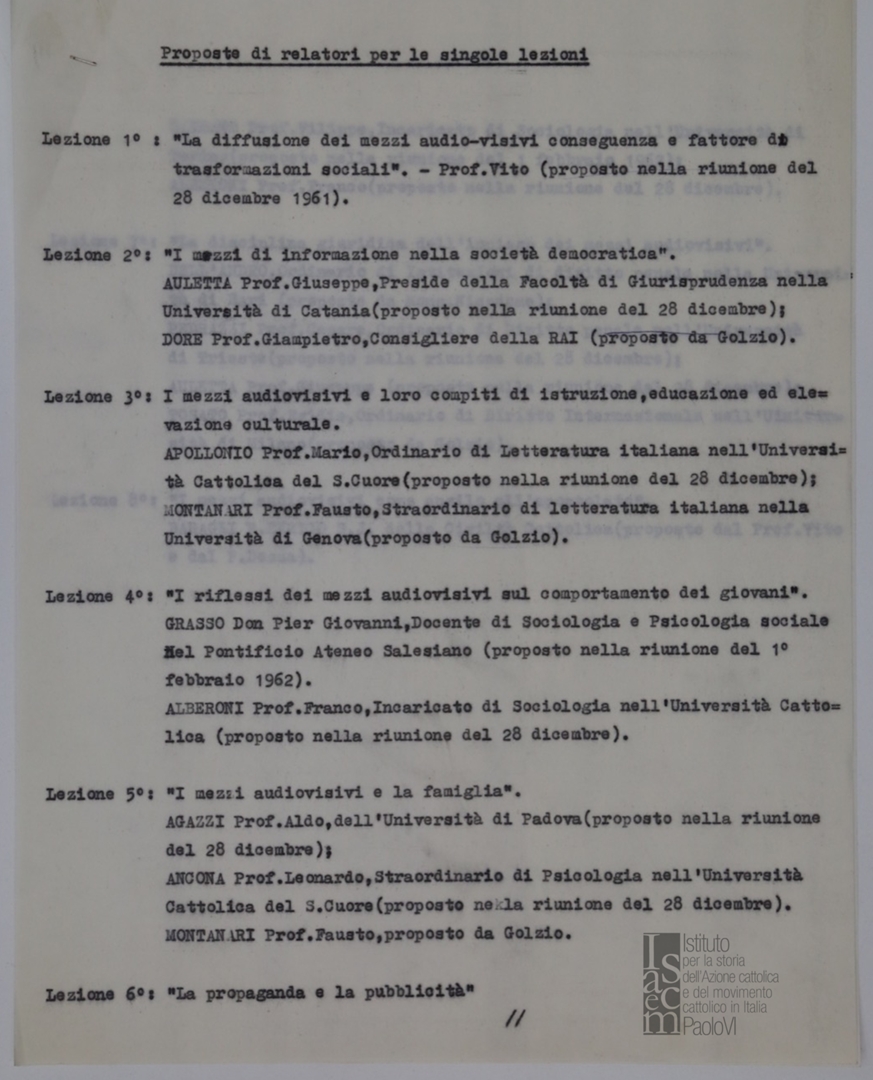 Lettera di don Francesco Angelicchio, consulente ecclesiastico dell'Ente dello spettacolo, a mons. Agostino Ferrari Toniolo, segretario delle Settimane sociali dei Cattolici d'Italia