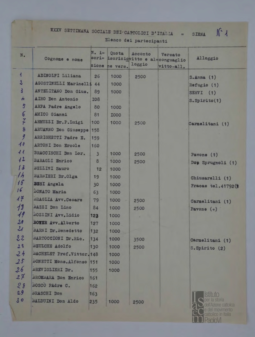 "XXXV Settimana Sociale dei Cattolici d'Italia. Siena. Elenco dei partecipanti"
