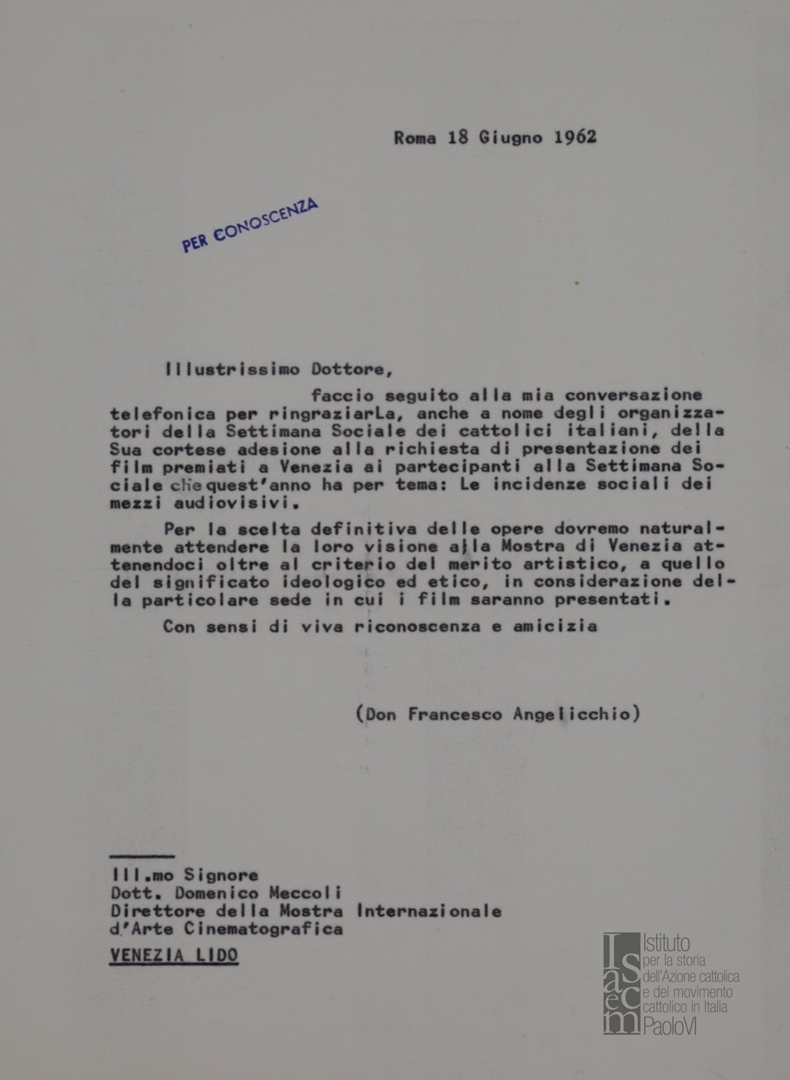 Lettera di don Francesco Angelicchio, consulente ecclesiastico dell'Ente dello spettacolo, al dott. Domenico Meccoli, direttore della Mostra internazionale d'arte cinematografica di Venezia