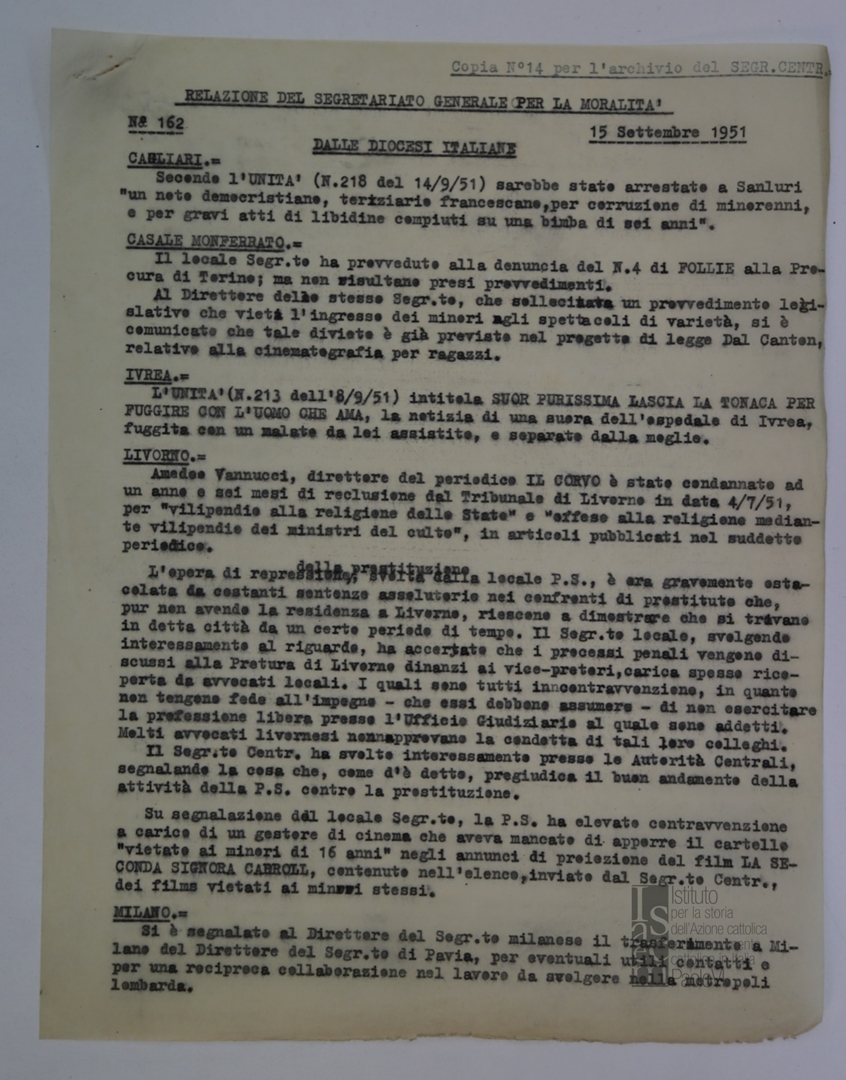 "Relazione del Segretariato Generale per la Moralità. Nr. 162"