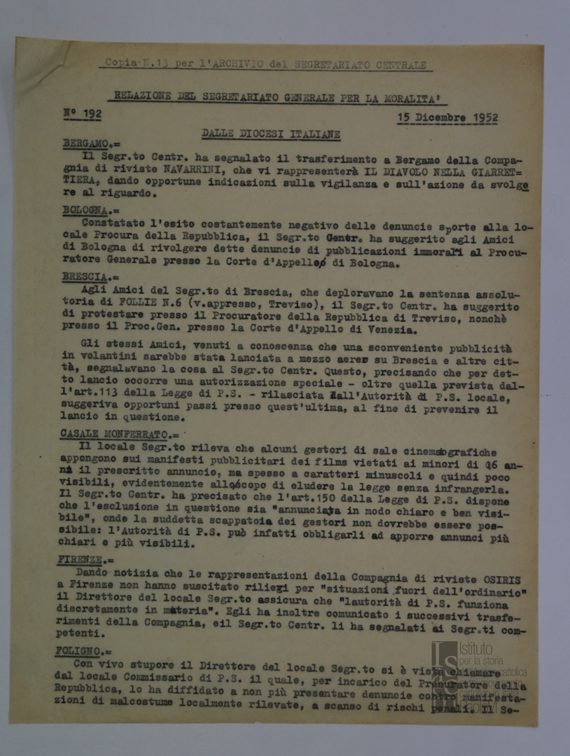 "Relazione del Segretariato Generale per la Moralità. Nr. 192"