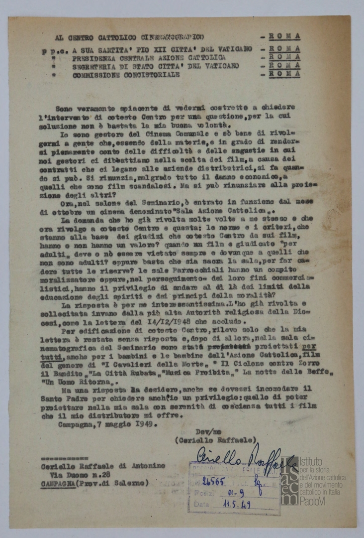 Lettera di Raffaele Ceriello, gestore del cinema comunale di Campagna in provincia di Salerno, a destinatari diversi