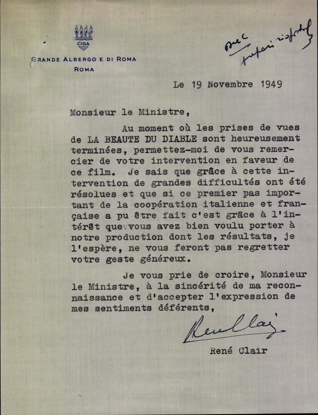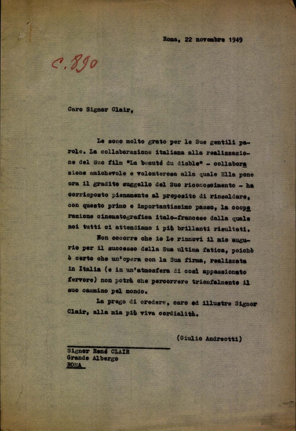 Lettera dell'on. Giulio Andreotti, sottosegretario di Stato alla presidenza del consiglio, al regista francese René Clair