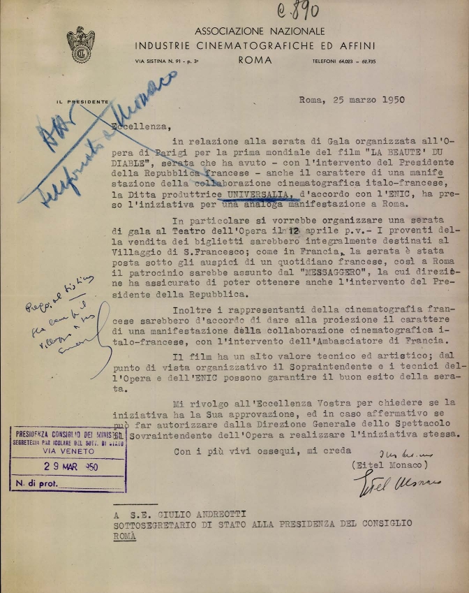 Lettera di Eitel Monaco, presidente dell'Associazione nazionale industrie cinematografiche ed affini - ANICA, all'on. Giulio Andreotti, sottosegretario di Stato alla presidenza del consiglio