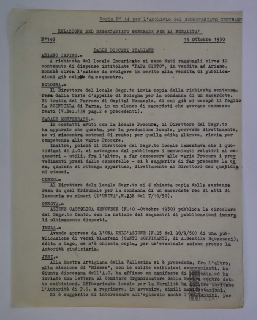"Relazione del Segretariato Generale per la Moralità. Nr. 140"