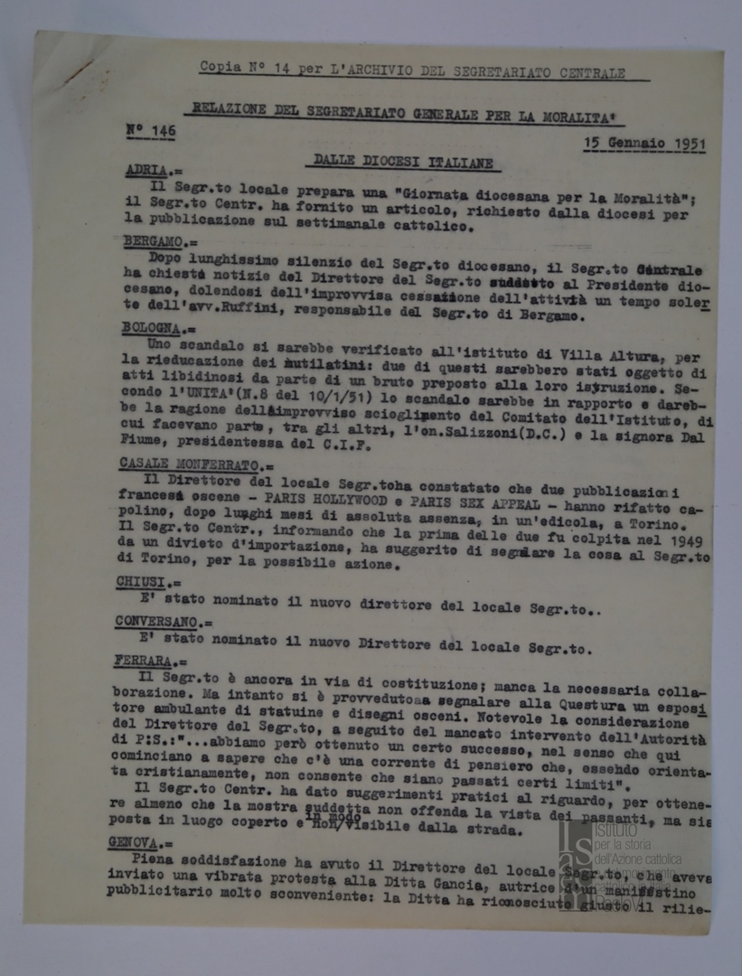 "Relazione del Segretariato Generale per la Moralità. Nr. 146"