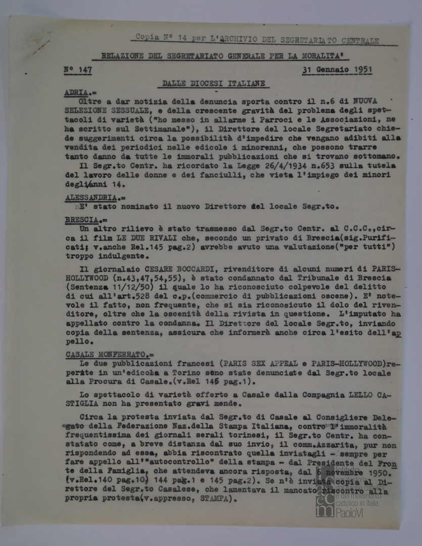 "Relazione del Segretariato Generale per la Moralità. Nr. 147"