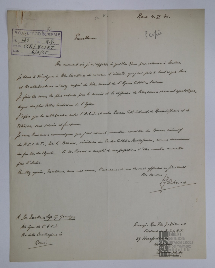 "Discours du Rev. Pere J. Dito O.P. président du B.C.I.R.T. (prononcé à une réunion spéciale de la direction générale de l'Action Catholique Italienne tenue à Rome le 28 mars 1945)"