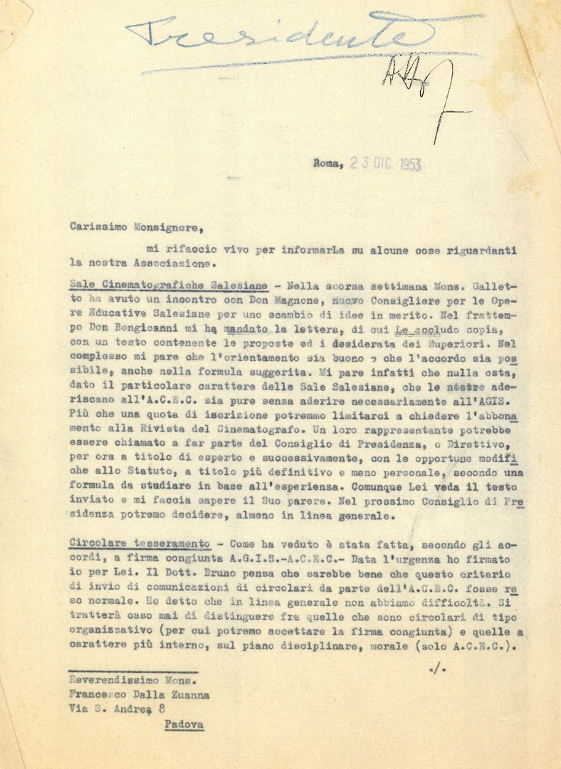 Lettera di mons. Francesco Dalla Zuanna, presidente dell'ACEC a Floris Luigi Ammannati, vice presidente