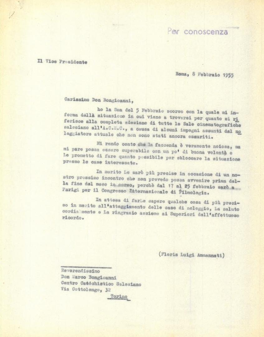 Lettera di risposta di Floris Luigi Ammannati, vice presidente dell'ACEC, a Marco Bongioanni, direttore del Teatro dei giovani - Letture drammatiche dell'Opera Don Bosco