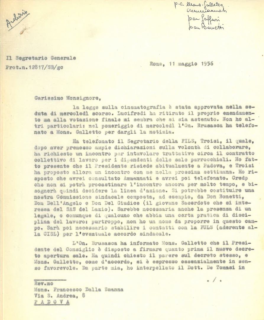 Lettera di Vittorino Veronese, presidente della cooperativa cinematografica "Lux Mundi", al sindacato dei lavoratori del cinema