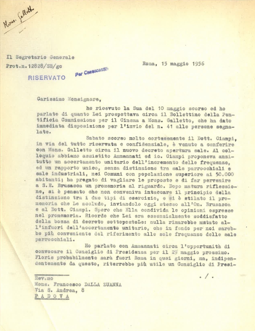 Lettera di Silvano Battisti, segretario generale dell'ACEC, a mons. Francesco Dalla Zuanna, presidente dell'ACEC