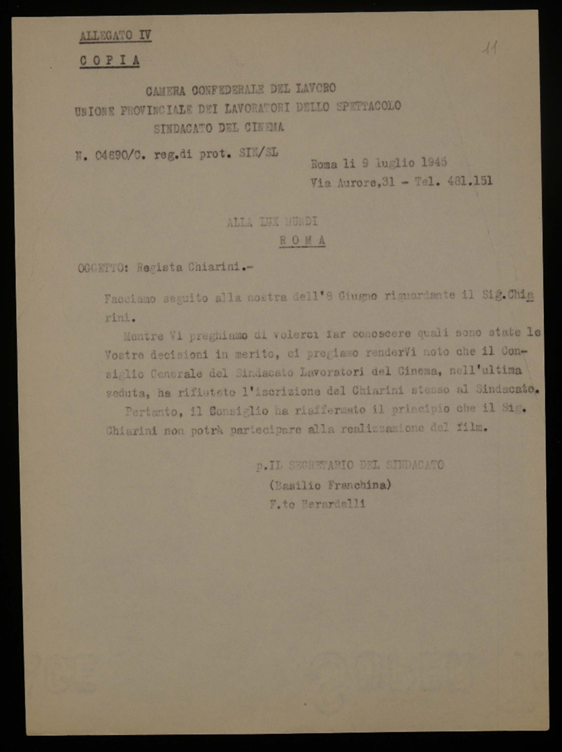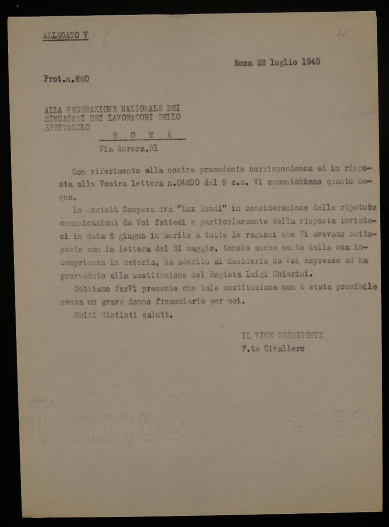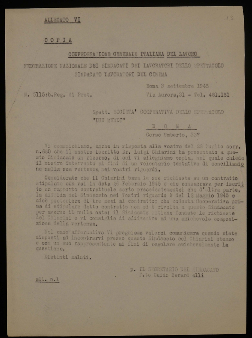 Lettera di Luigi Chiarini al Sindacato dei lavoratori del cinema
